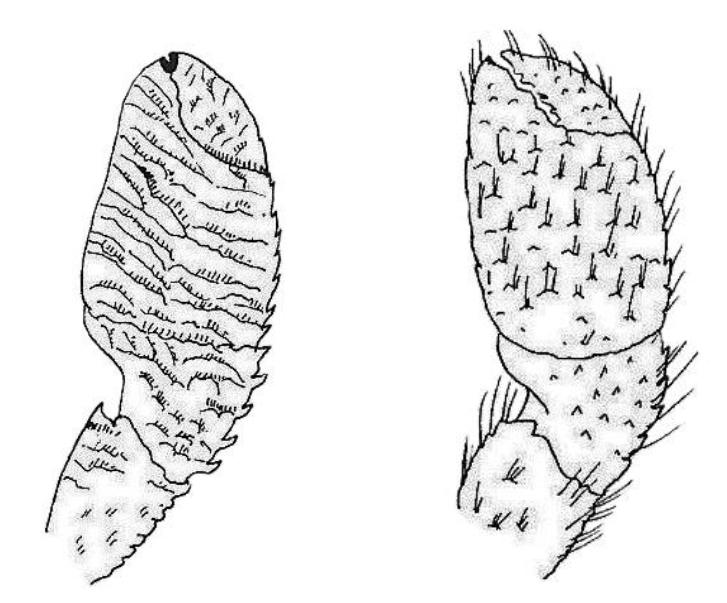 Chela di Upogebia tipica di 46 mm (esempl. conservato), spiaggiata a Baia del Re (Fano), gennaio 2002