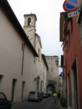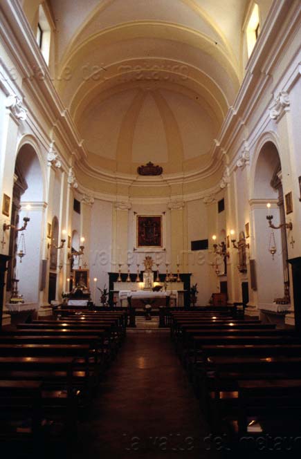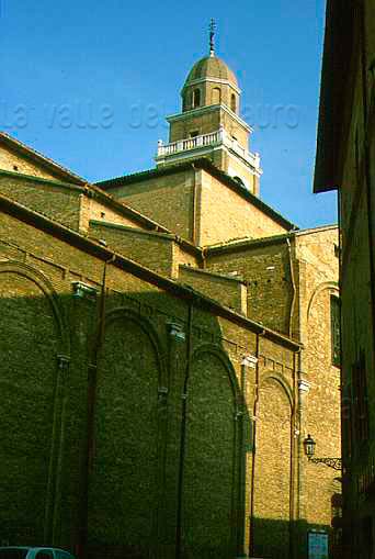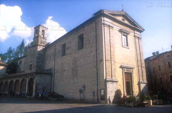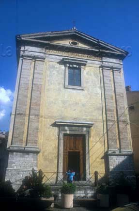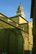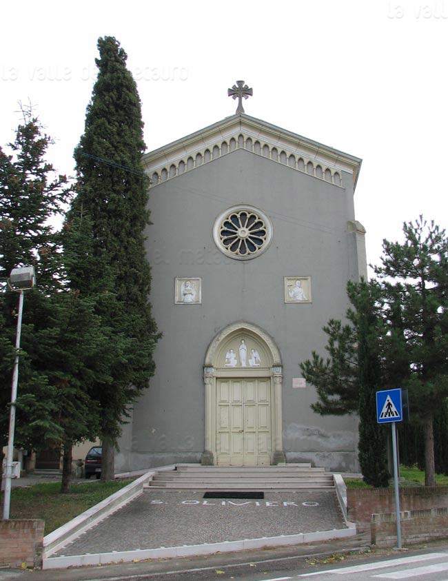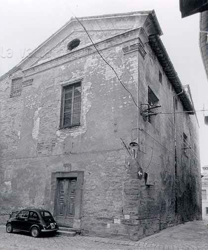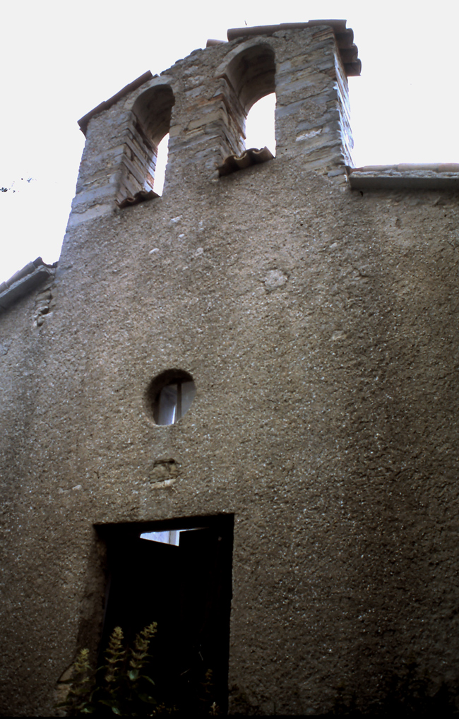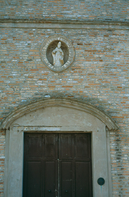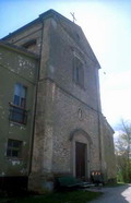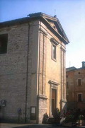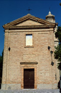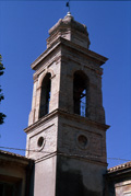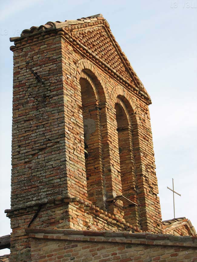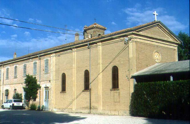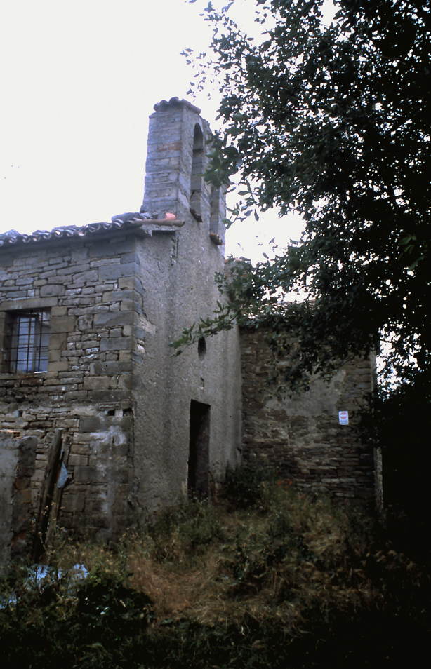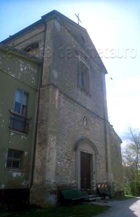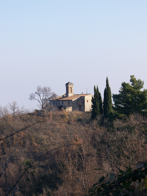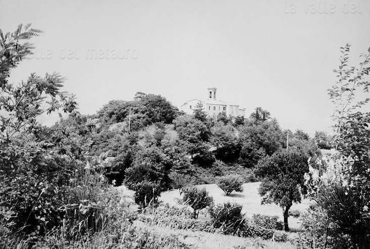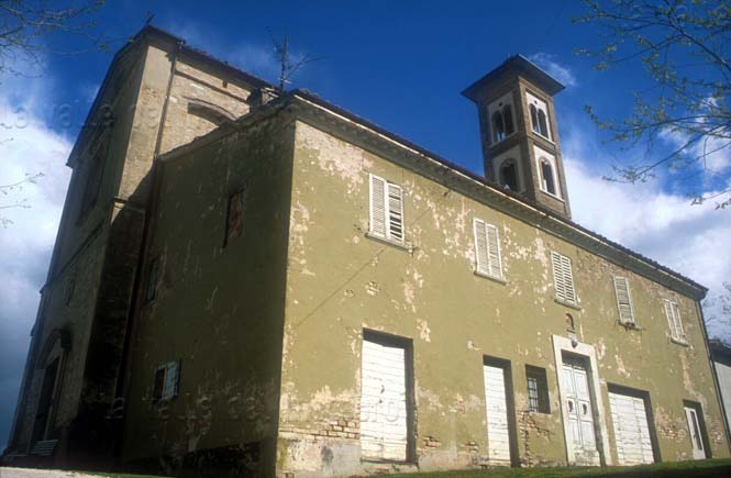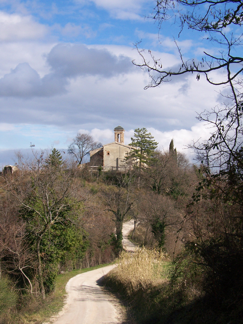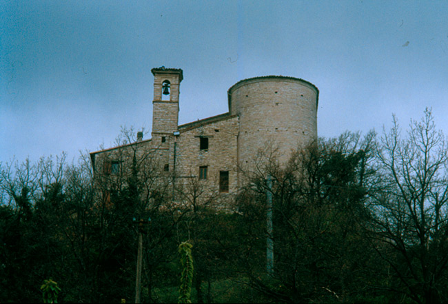 Chiesa di S. Nicolò a Torricella (Fossombrone) vista dalla valle del Tarugo, aprile 1999