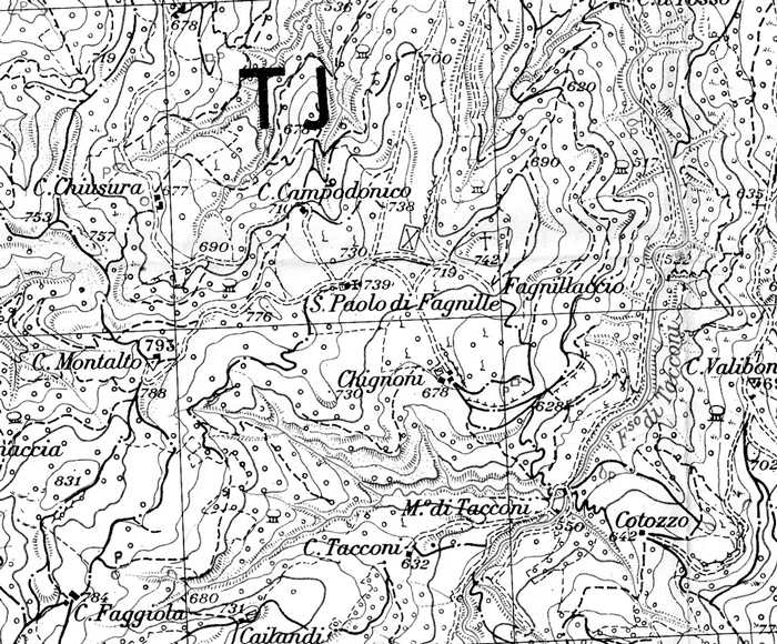 Chiesa di S. Paolo di Fagnille (Apecchio). Carta IGM 1:25.000 115 I S.E., rilievo 1952 (autorizz. IGM n. 4877 del 2-11-1998)