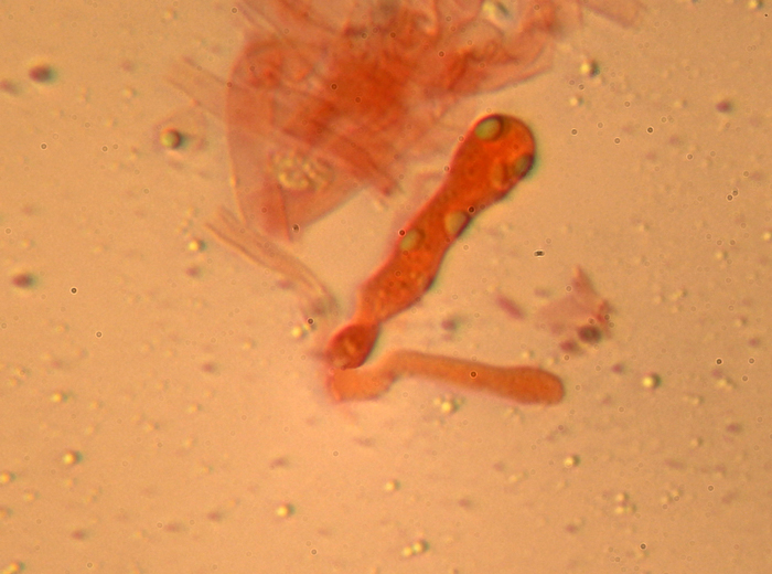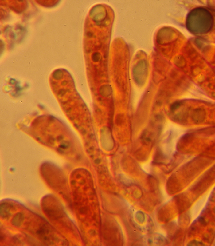 Clitocybe inornata, collina del Prelato a Fano, ottobre 2012. Basidi clavati con basidiolo alla base che li unisce