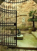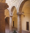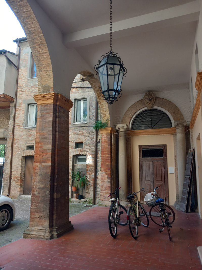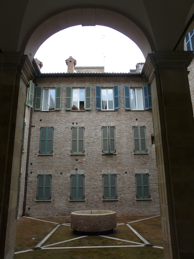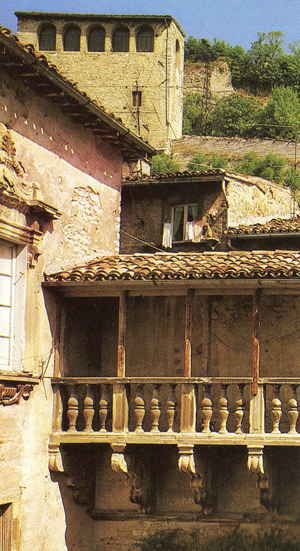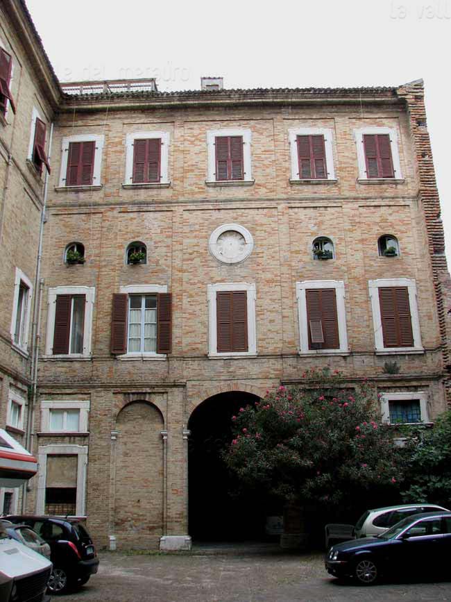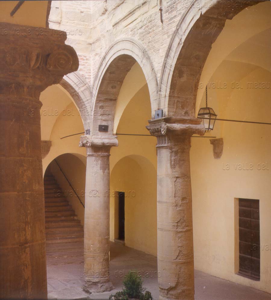 Cortile interno della Corte Bassa, Fossombrone. Sullo sfondo è visibile la Corte Alta (da opuscolo: Comunità montana del Metauro, 1983)