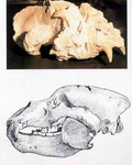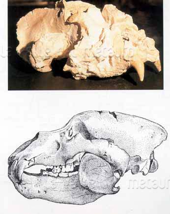 Cranio di Ursus spelaeus (Orso delle caverne), custodito nel Museo dei Fossili e Minerali del Monte Nerone ad Apecchio, e suo disegno ricostruttivo per una migliore lettura
