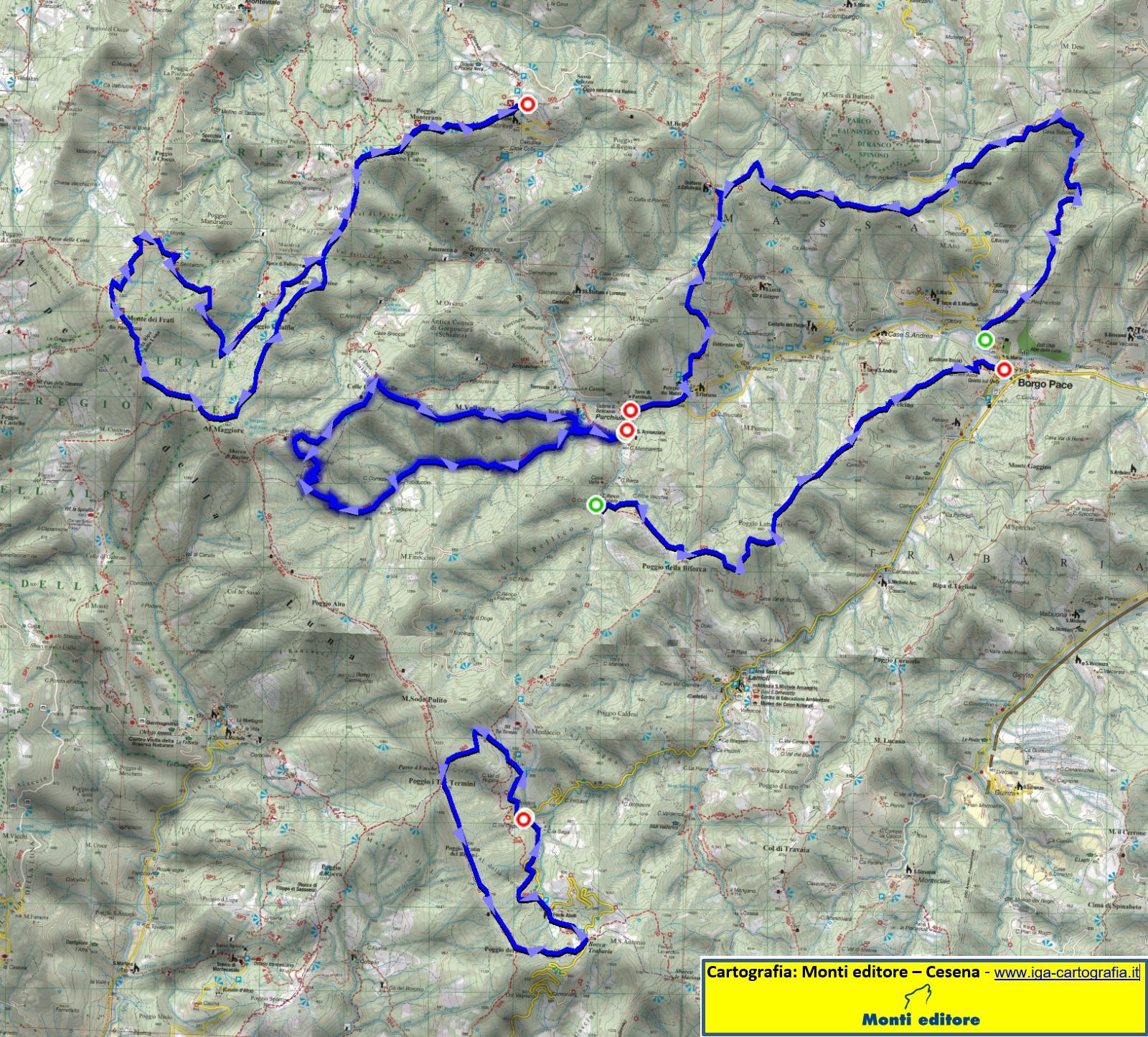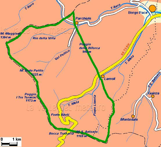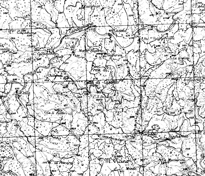 Alta valle del Candigliano con da sinistra a destra: Cella; l'enclave di Monte Ruperto (Città di Castello), delimitata da una linea di punti e di +; Cassìa; Palazzo Valguerriera. Carta IGM 1:25.000 115 I N.E. (autorizz. IGM n. 4877 del 2-11-1998)