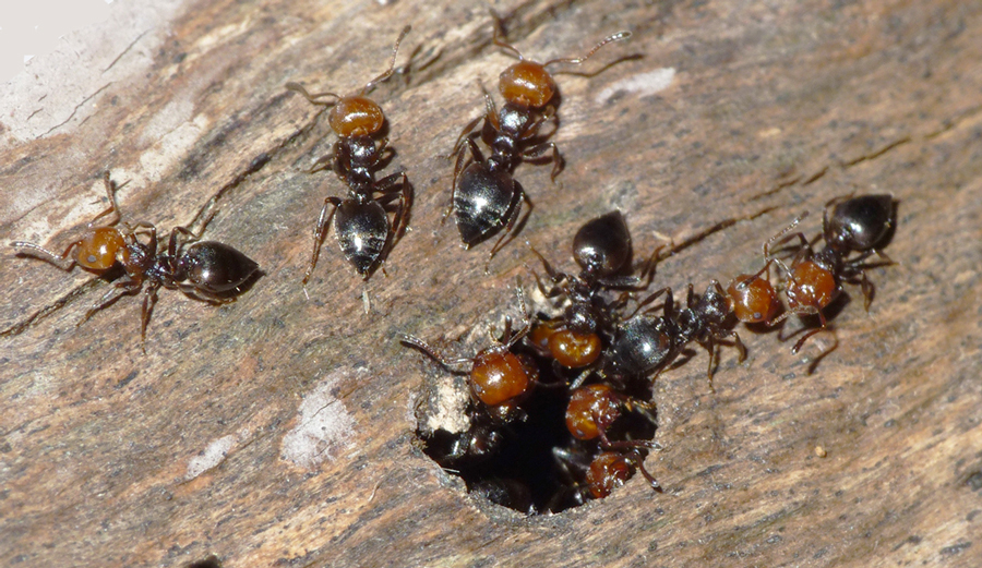Crematogaster scutellaris che escono dal nido posto in un tronco secco, area verde di Casa Archilei alla periferia di Fano, marzo 2023