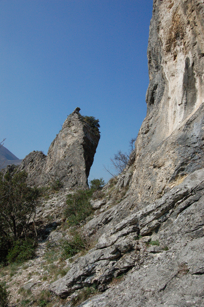 Cresta impostata su faglia, Maiolica, Gorgo a Cerbara (versante destro), in prossimità della terminazione sud-occidentale della gola, marzo 2007