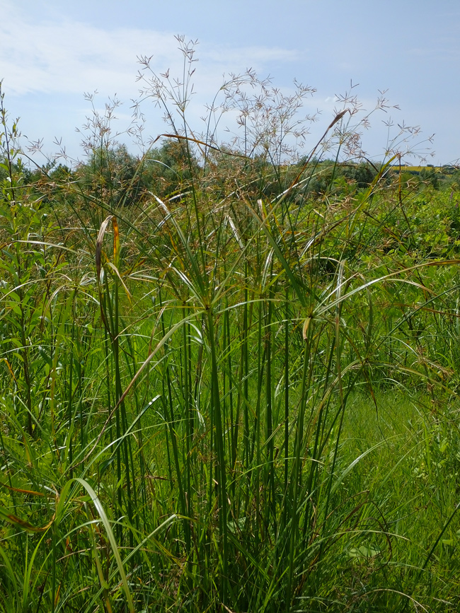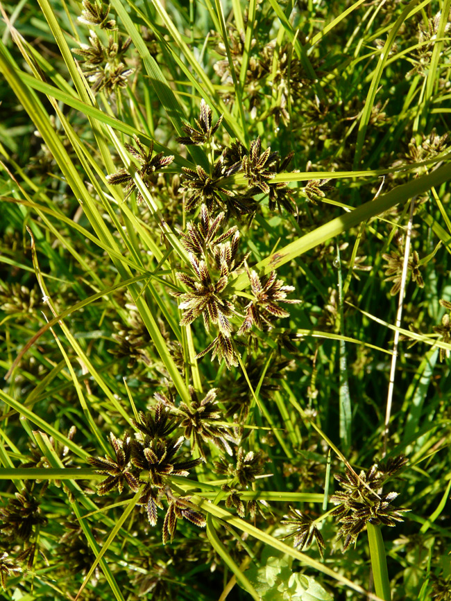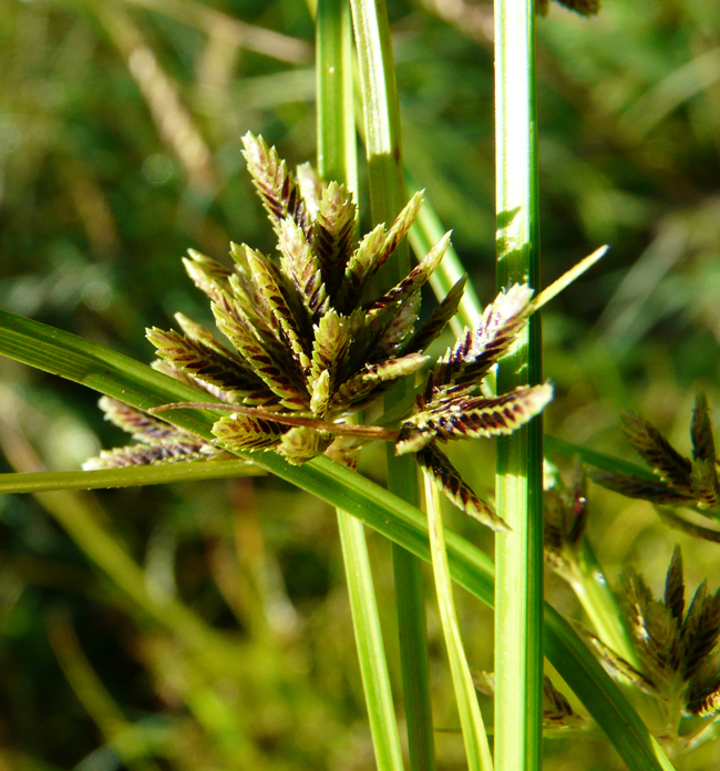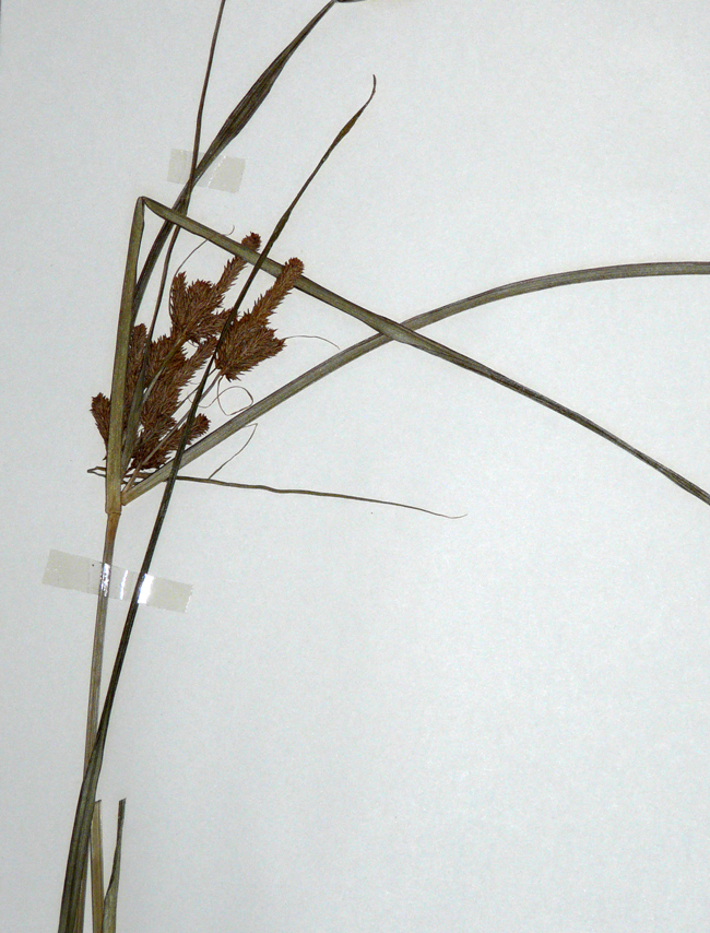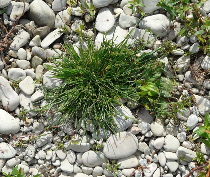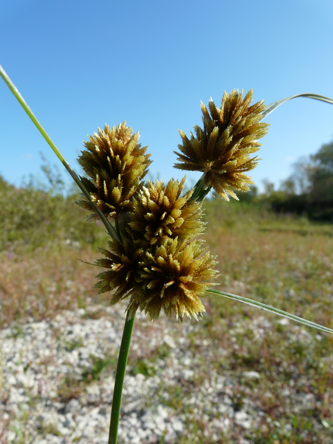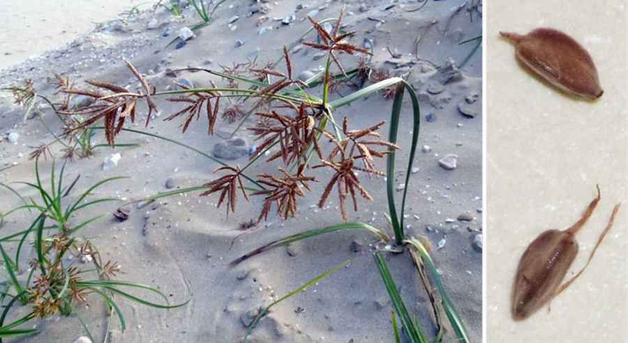 Cyperus rotundus, scarpata sabbiosa asciutta al margine della spiaggia di Torrette (Fano), 4 ottobre 2020; a dx: acheni fusiformi, trigoni (Erbario L. Poggiani)