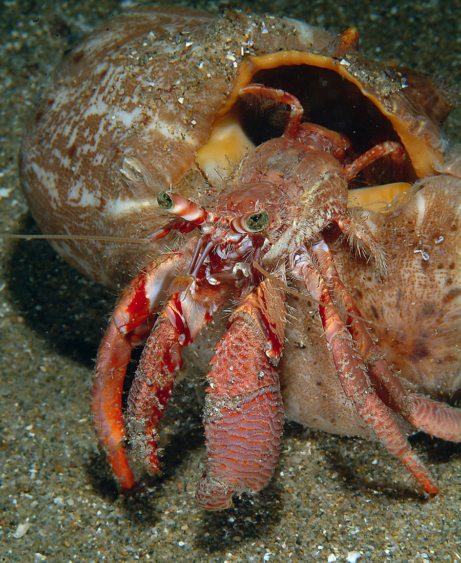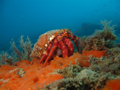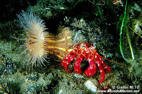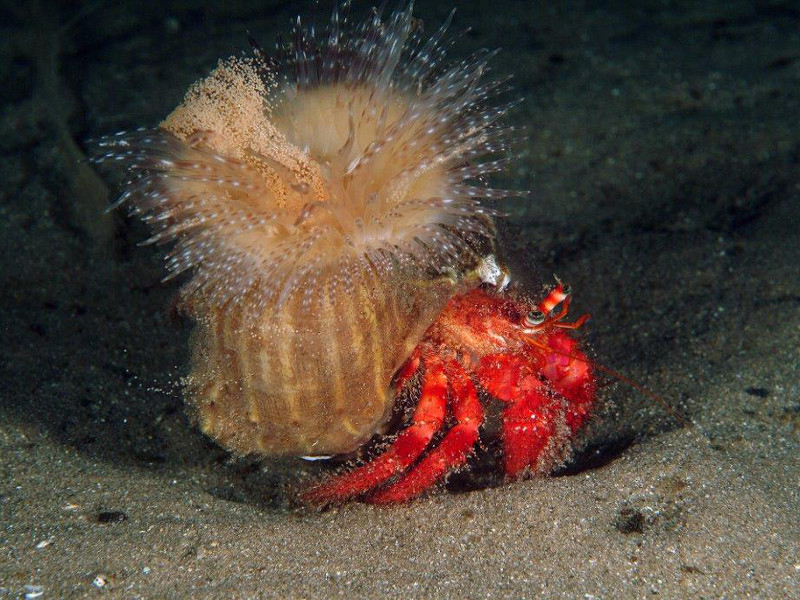 Dardanus calidus con attinia attaccata al nicchio che lo ospita, Otranto, Basso Adriatico, giugno 2011 (foto S. Guerrieri)