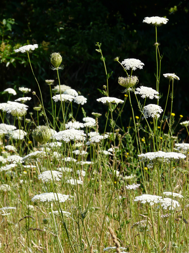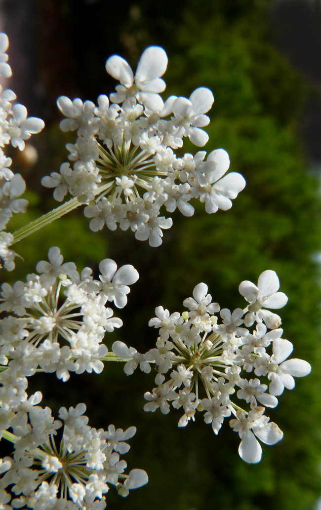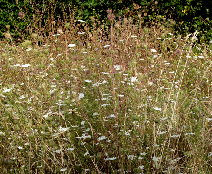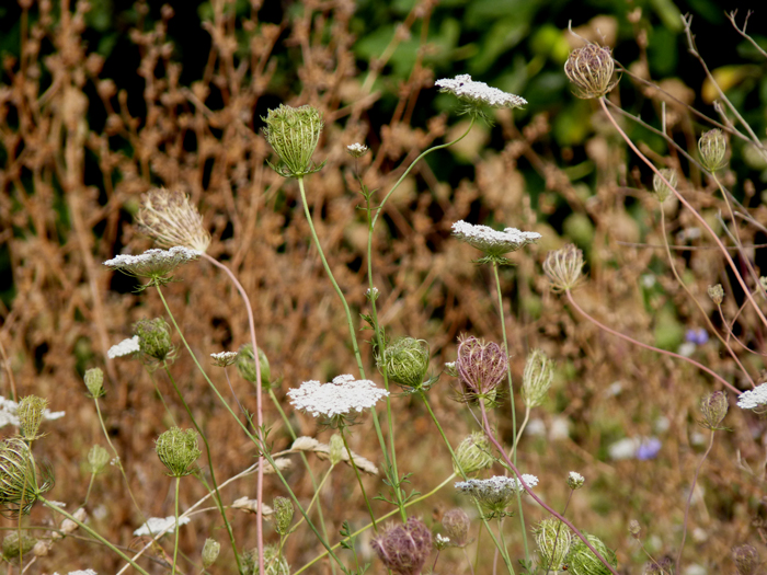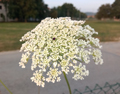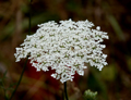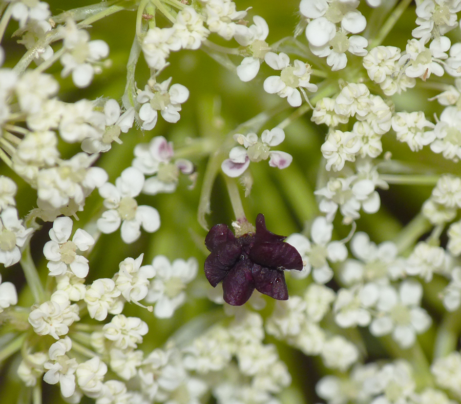 Daucus carota, parte centrale dell'infiorescenza con fiore sterile di colore rossiccio molto scuro