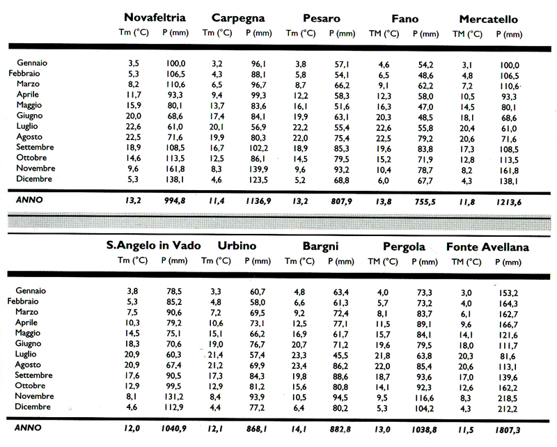 Dati termopluviometrici di alcune località della Provincia di Pesaro e Urbino relativi al periodo 1960-1981; Carpegna 1965-1981 e Sant'Angelo in Vado 1969-1981 (da URBINATI, 2000)
