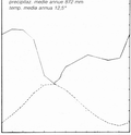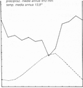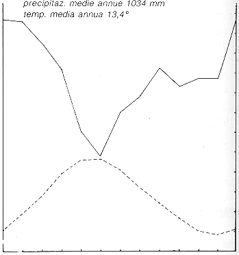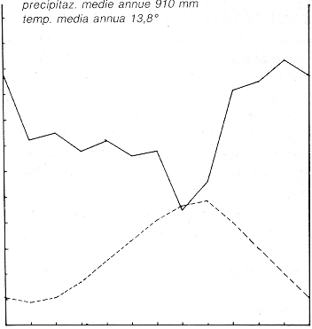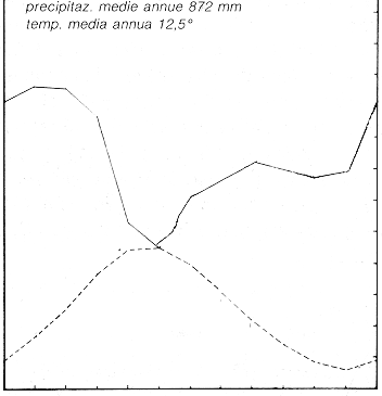 In ascissa i mesi dell'anno, nell'ordinata di sinistra la temperatura media mensile (linea continua) ed in quella di destra le precipitazioni mensili (linea tratteggiata). La scala delle precipitazioni è doppia rispetto a quella delle temperature (da URBINATI, 2000)