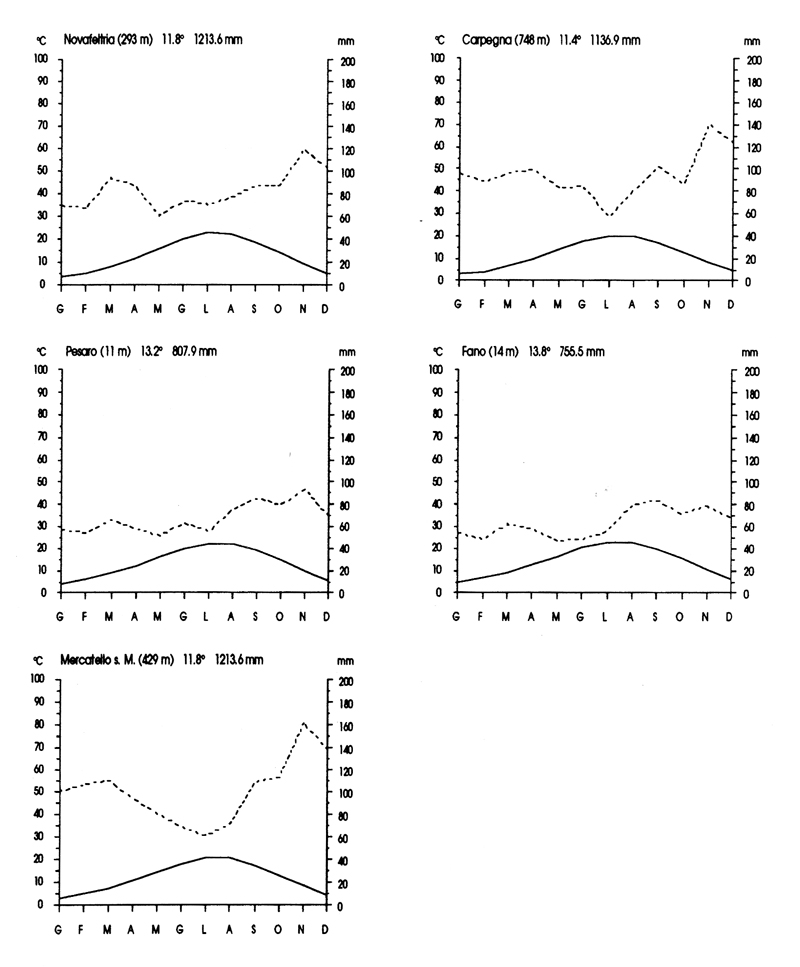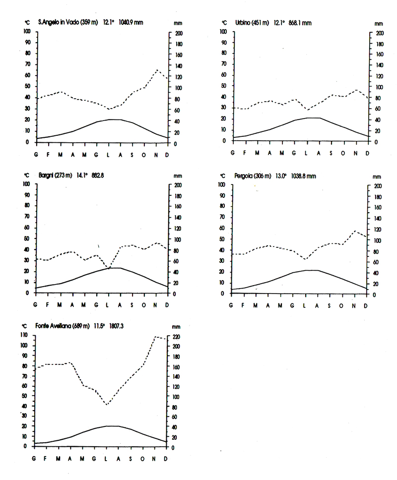 Diagrammi pluviotermici di alcune località della Provincia di Pesaro e Urbino.