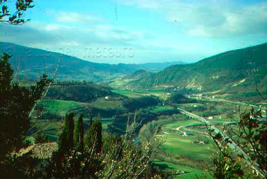 Di fronte e verso sinistra, in destra idrografica del F. Metauro, i terrazzi vallivi della zona di Carpineto a Fossombrone. La piana alluvionale sulla quale scorre il fiume è quella di Pian Cerreto; sulla destra le pendici dei Monti della Cesana, sullo sfondo il M. Pietralata (Monti del Furlo)