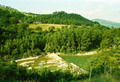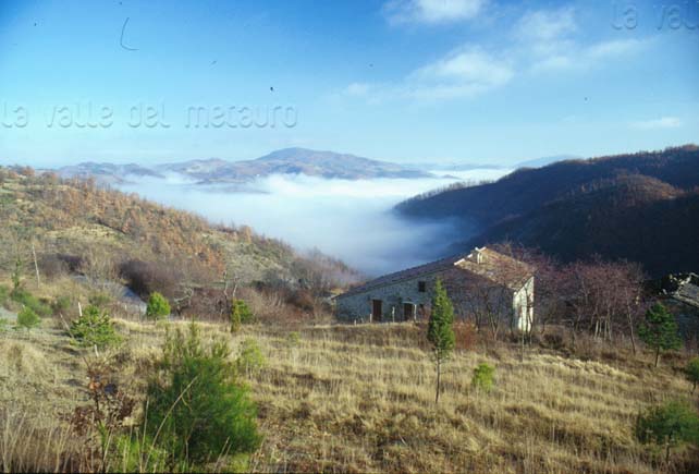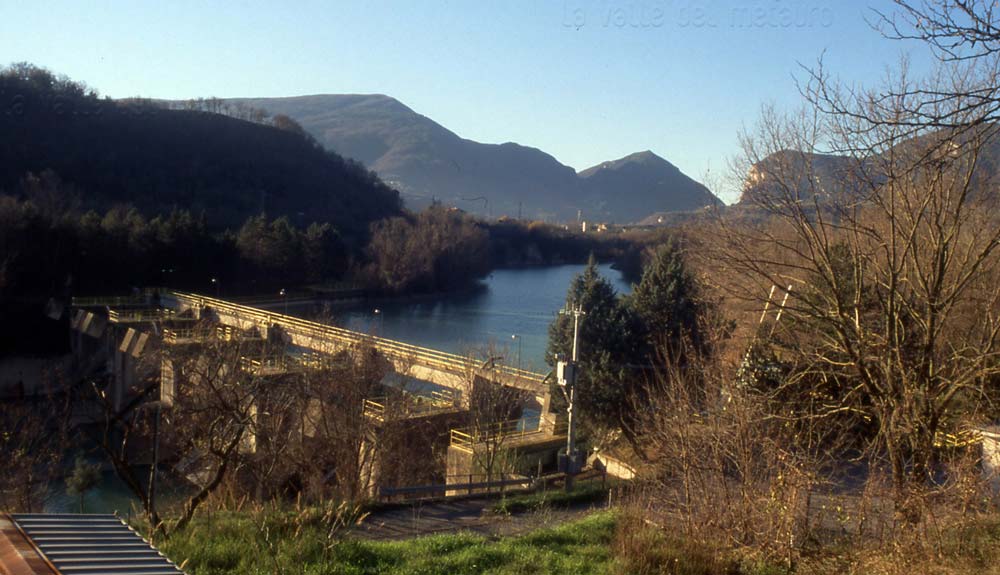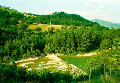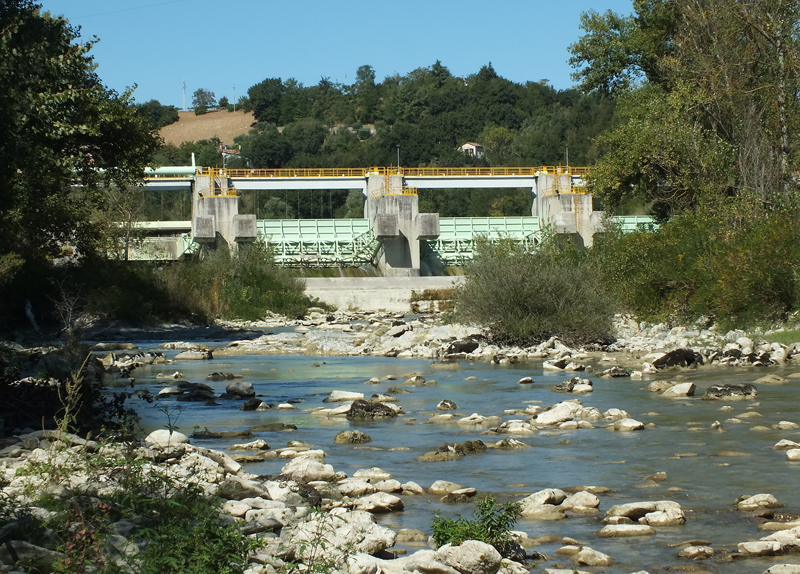Diga Vecchia (Fossombrone). La briglia è stata costruita verso il 1930-40, occludendo una sorgente sulfurea che si trovava ad un livello basso dell'alveo del Metauro