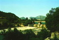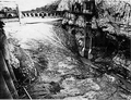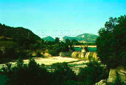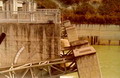 Diga del Furlo: l'invaso prosciugato nel 1981 per fare la manutenzione allo scarico di fondo che si nota sulla destra della foto. Sullo sfondo si vede la diga ad arco ed una paratoia; in primo piano a sinistra le opere di presa della galleria a pressione. E' evidente la notevole quantità di materiale alluvionato, che diminuisce la capacità dell'invaso