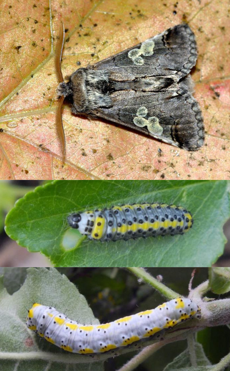 Diloba caeruleocephala maschio (foto Peter Gergely, Saxifraga, http://www.freenatureimages.eu, CC BY-NC-SA); bruchi di Diloba caeruleocephala, M. Paganuccio (Monti del Furlo). In alto: 7 maggio 2014; in basso: esemplare allevato, 15 maggio 2014 (foto V. Dionisi)