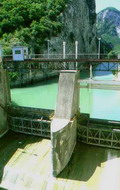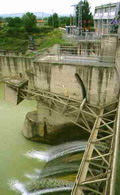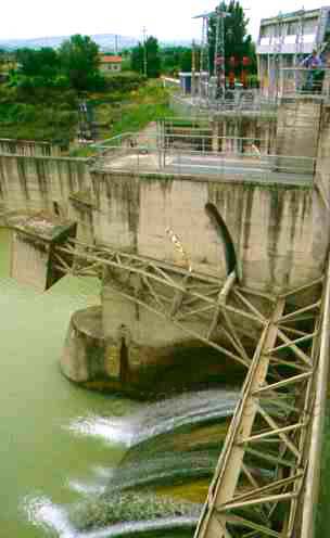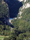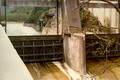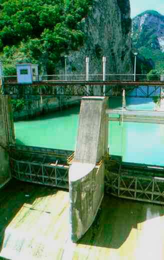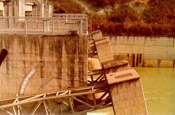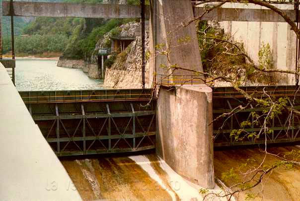 Diga del Furlo: le paratoie, aperte in caso di piene. Sullo sfondo si notano le opere di presa della galleria in pressione che preleva l'acqua dal bacino per portarla alla centrale più a valle