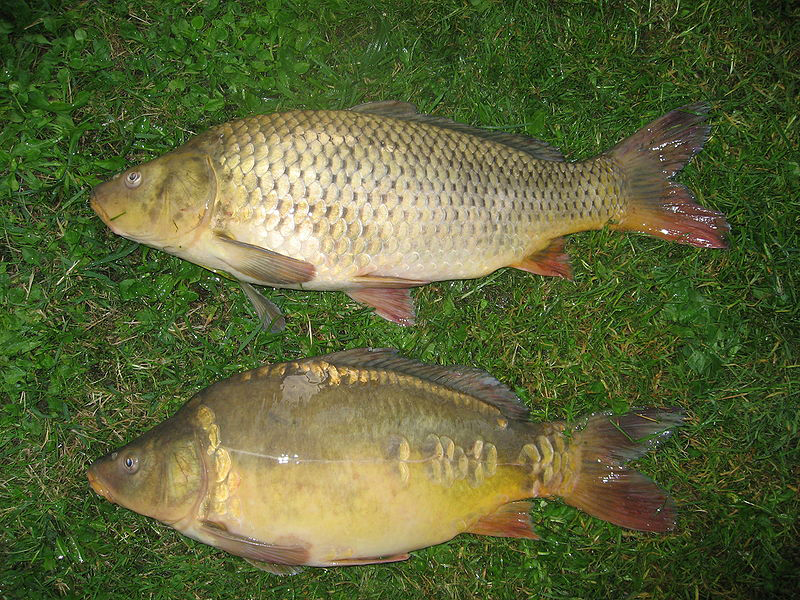 Due forme di Cyprinus carpio con diversa quantità di squame (foto Dezidor, Wikimedia Commons, CC-BY-SA 3.0)