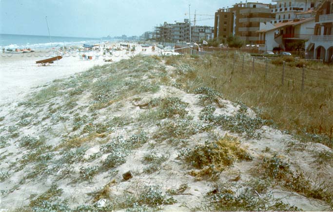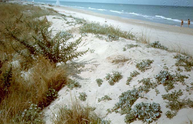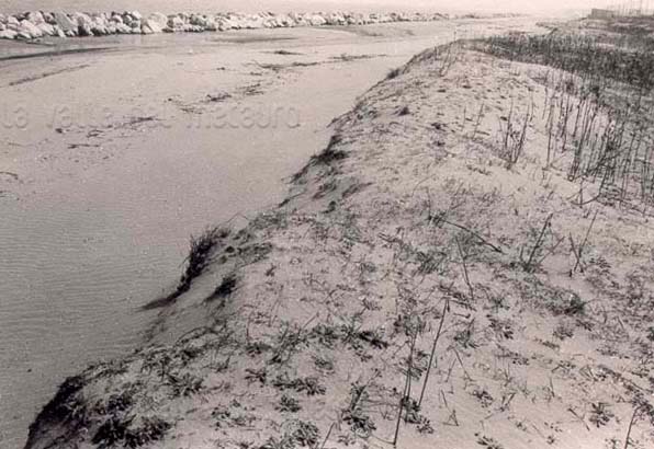 Due ricci di mare comuni (Paracentrotus lividus), uno dei quali privo di aculei; in basso a dx una masserella di nidamenti di murice, spiaggia di ciottoli del Colle San Bartolo a Pesaro, maggio 1981