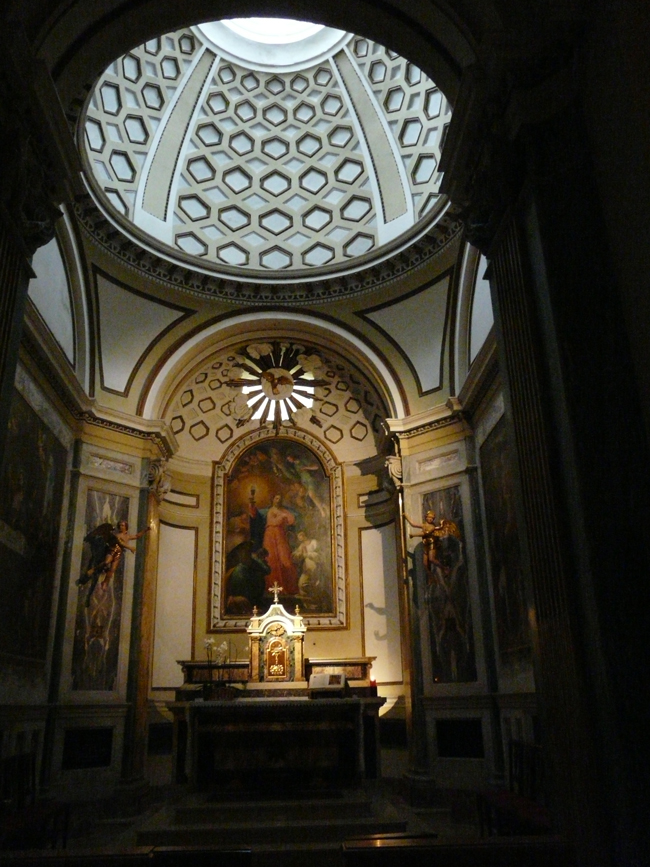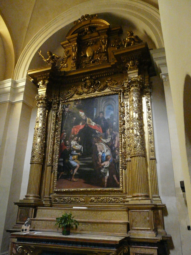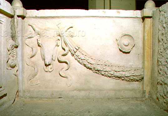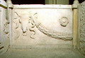 Duomo di Fano, lastra del pulpito. Decorazione ad altorilievo con festone, bucranio e pàtera pertinente ad un'ara votiva di epoca imperiale (retro)
