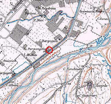Edicola a la Porsangola (Fano). Carta top. Reg. Marche 1:25.000 110 III (autorizz. Ufficio Cartografia e Inform. Territoriali Reg. Marche del 13-3-1999 e aut. IGM n. 4877 del 2-11-1998)