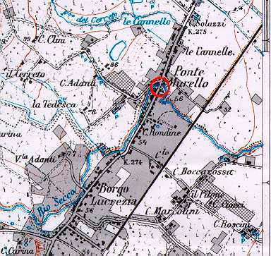 Edicola a Ponte Murello-Lucrezia (Cartoceto). Carta top. Reg. Marche 1:25.000 109 II (autorizz. Ufficio Cartografia e Inform. Territoriali Reg. Marche del 13-3-1999 e aut. IGM n. 4877 del 2-11-1998)