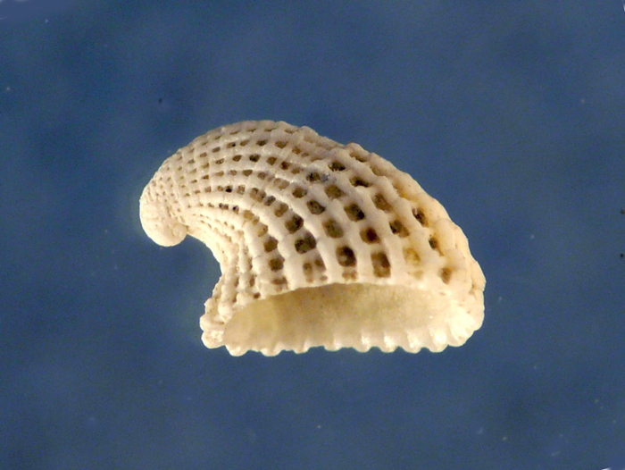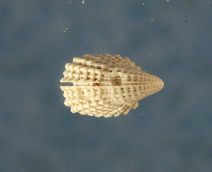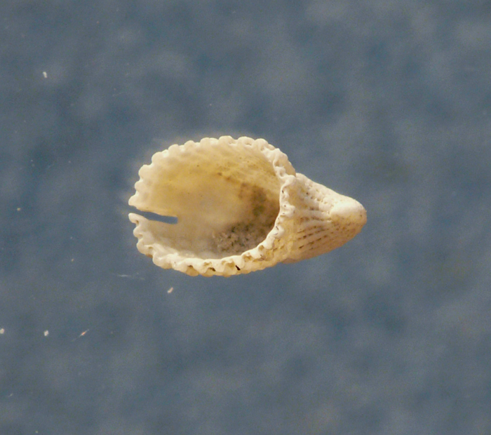 Emarginula (cfr.) rosea di 4 mm, al largo di Fano a 54 m di profondità, marzo 2004