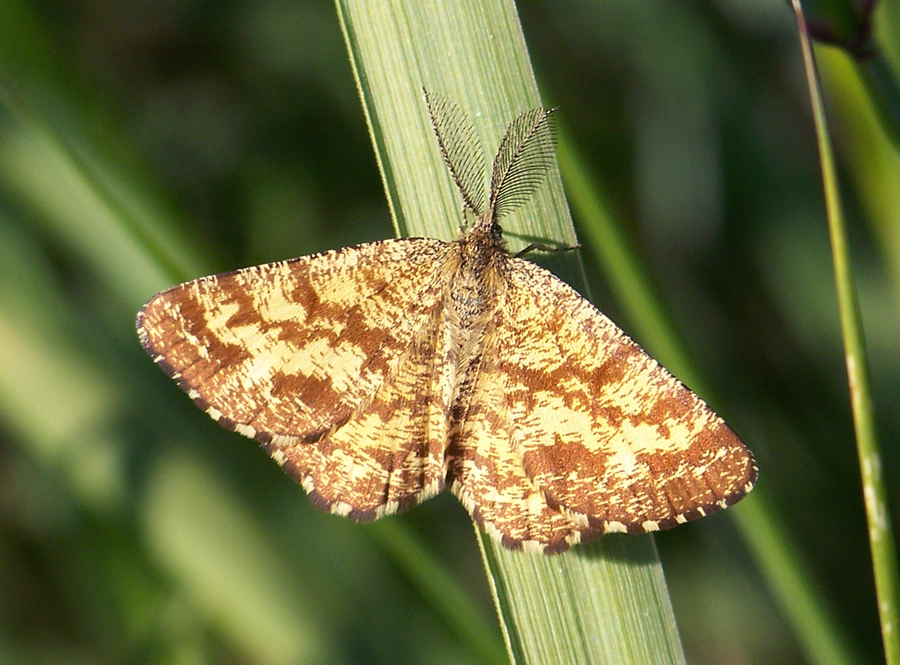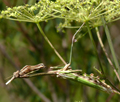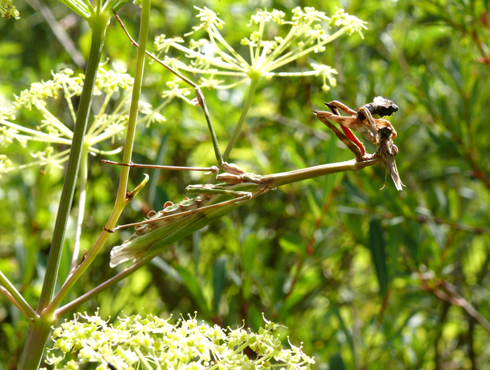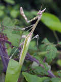 Empusa pennata femmina, Mercatello sul Metauro, luglio 2014 (foto V. Dionisi); a dx: maschio, con antenne lunghe e pennate, Spagna (foto Raúl Baena Casado, Wikimedia Commons, CC BY 2.0)