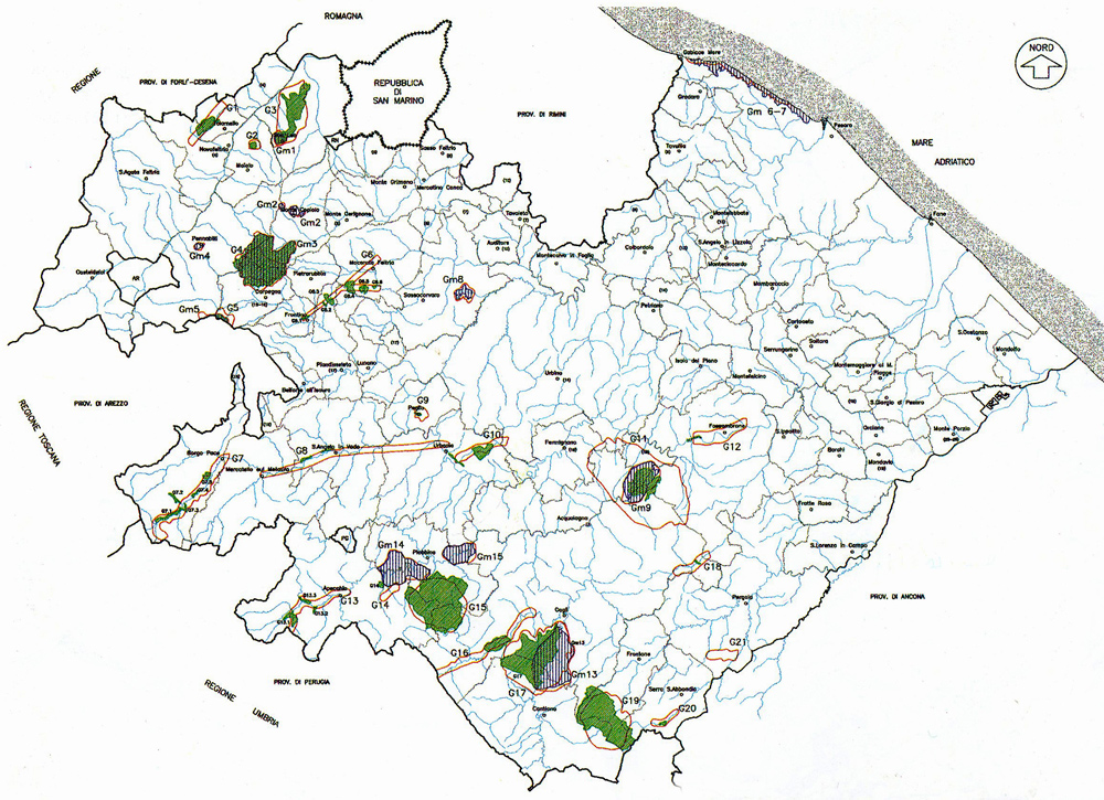 Emergenze geologiche e geomorfologiche individuate dal P.P.A.R. delle Marche (da: BIAGIANTI et al. 1999)