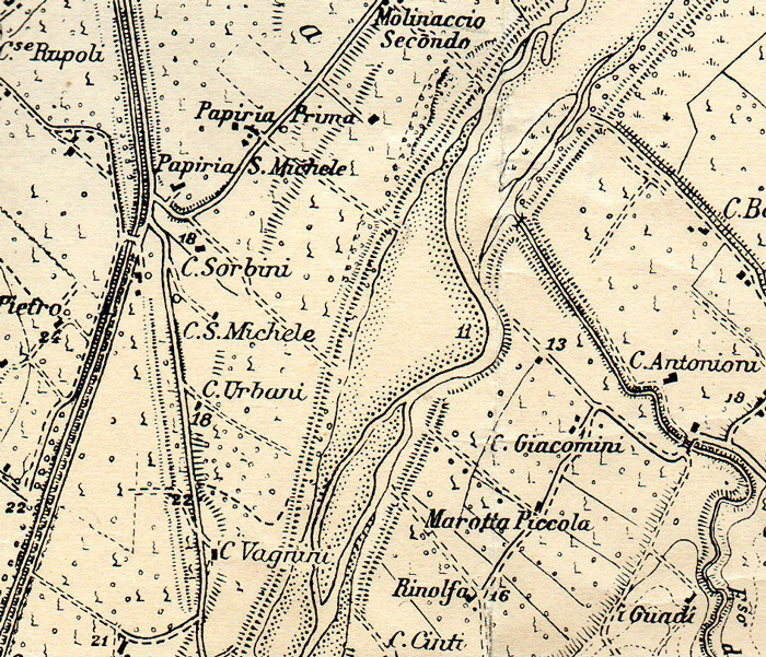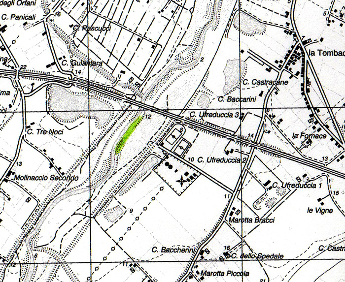 F. Metauro a 4 km dalla foce nel 1948. Il tratto di area campione è quello dove il fiume compie una curva scostandosi dalla riva sinistra. Carta IGM 1:25.000 110 III N.O., ricogn. generali 1948 (autorizz. IGM n. 4877 del 2-11-1998)