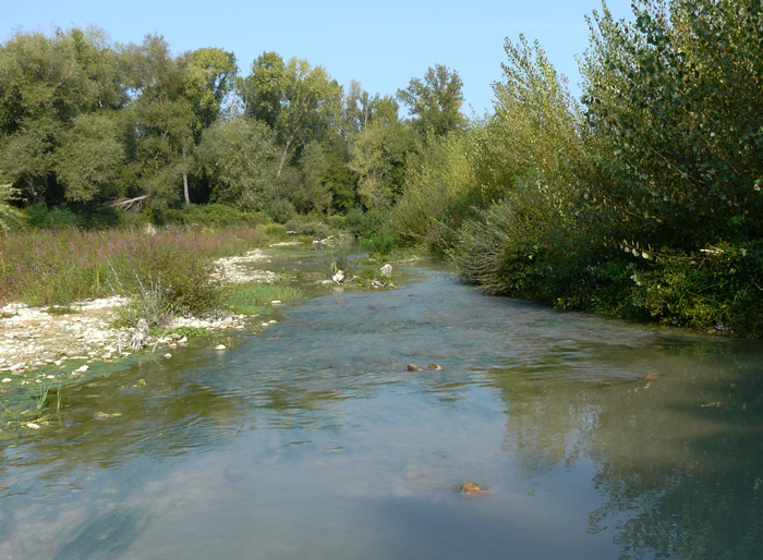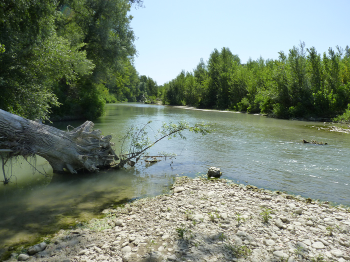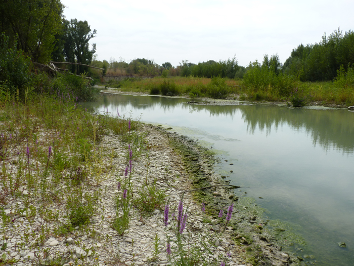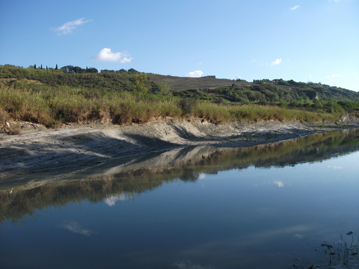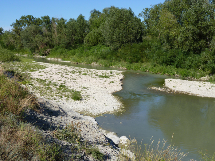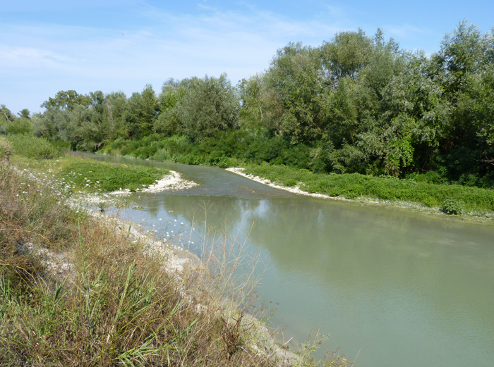 F. Metauro a 2,5 km dalla foce (Fano), settembre 2011. Vista verso monte, con sullo sfondo una ripa di erosione in riva destra