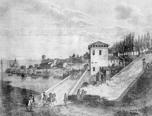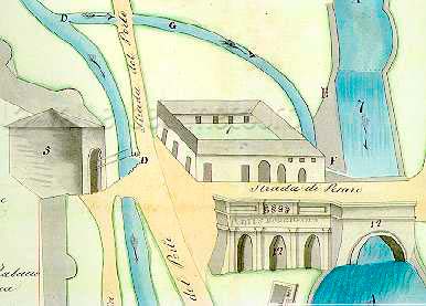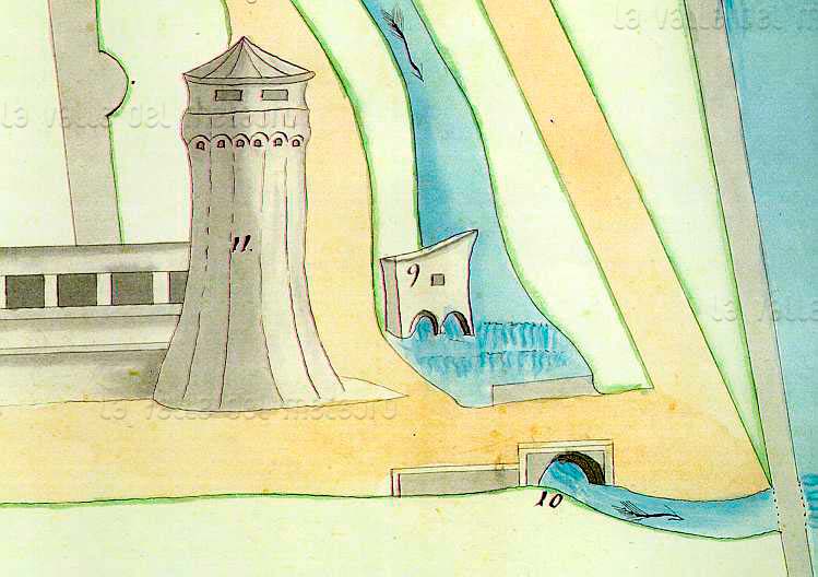 Legenda: (9) Fabbrica di gesso (ex Molinello); (10) Ponte che riceve tutte le acque del canale dei mulini; (11) Fortezza