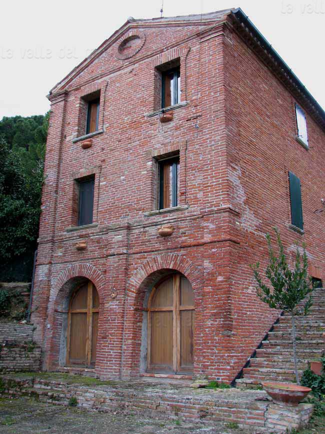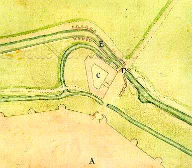 Fabbrica del Tabacco con suo canale. Legenda: A. Città di Fano, C. Fabrica del tabacco con suo canale, D. Ponte Astalli, sotto di cui passa il ramo del fiume Metauro, che scende al Porto, E. Liscia in cui scende rapido il fiume Metauro (Romualdo Valeriani (?), Pianta della spiaggia e canale di Fano (dopo il 1724)) (Da: Biblioteca Federiciana di Fano, Sala Manoscritti, Disegni, B3 - 41)
