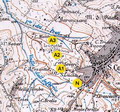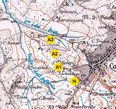 Fig. 1: Aree archeologiche presso San Costanzo: N = cimitero; 1 = Case Severi; 2 e 3 le Grotte. Carta Reg. Marche 1:25.000 110 III (autorizz. IGM 4877/98)