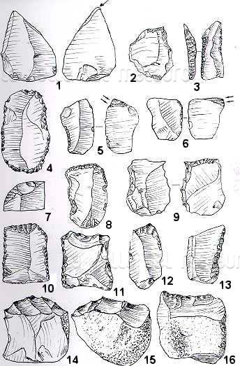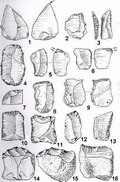 Fig. 6 - Fano: Foce dell'Arzilla, industria litica. Particolari da 1 a 16 (vedi descrizioni nel testo)