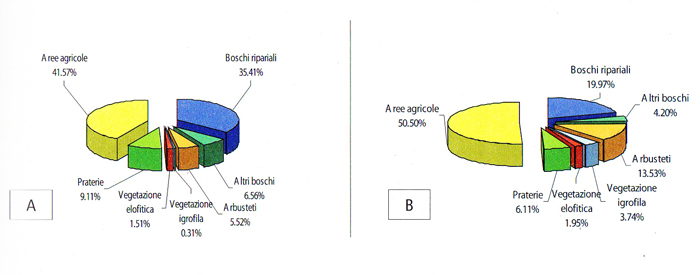 Fig. 9 - Coperture percentuali di ricoprimento della vegetazione nel S.I.C Tavernelle sul Metauro (A) e nel S.I.C Fiume Metauro da Pian di Zucca alla foce (B)