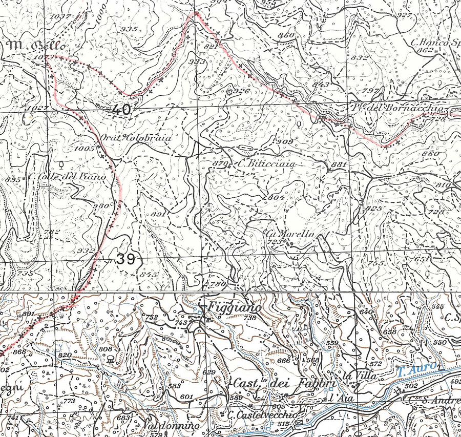 Figgiano e Oratorio Colubraia, Comune di Borgo Pace. Carta IGM 1:25.000 115 I N.O., rilevam. 1952 e 108 II S.O., rilevam. 1937 (autorizz. IGM n. 4877 del 2-11-1998)