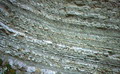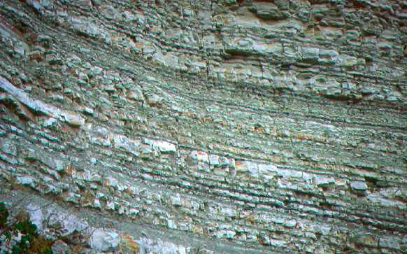 Fila di molari inferiori destri di Microtus gruppo savii, Prelato di Fano, dicembre 1982. Primo molare con 7 triangoli; in rosso l'inizio del secondo molare