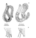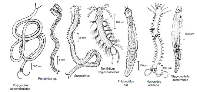 Figura 1A. Rappresentazione delle due principali famiglie di oligocheti meiobentonici: Tubificidae e Enchytraeidae (Giere, 2009). Figura 1B. Rappresentazione delle differenti forme di sete caratterizzati gli oligocheti: biforcate (sinistra) e lisce/semplici (destra) (Giere, 2009).