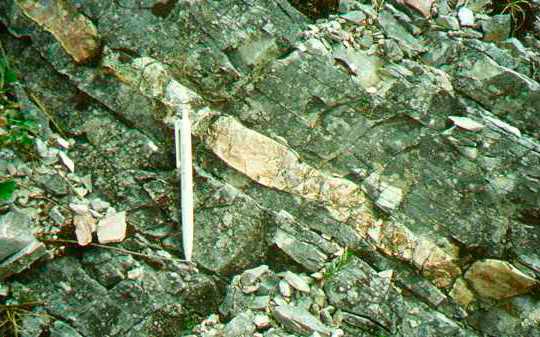 Fila di molari inferiori destri di Myodes glareolus, Casale nella Serra di Burano, dicembre 1989. Primo molare con 5 triangoli; in rosso l'inizio del secondo molare