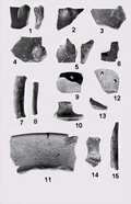 Fila sinistra di molari superiori di Apodemus sylvaticus, Abbadia di Lastreto ai margini del M. Paganuccio, Fossombrone, maggio 1982. Primo molare superiore con tubercolo 7 separato dal 4 e secondo molare superiore con tubercolo 9 presente