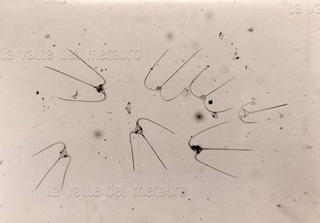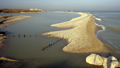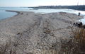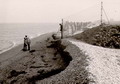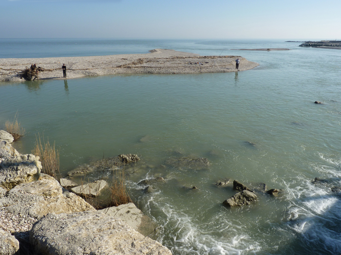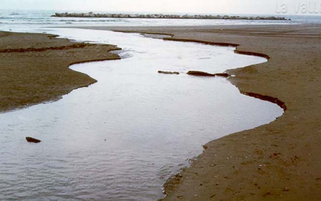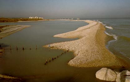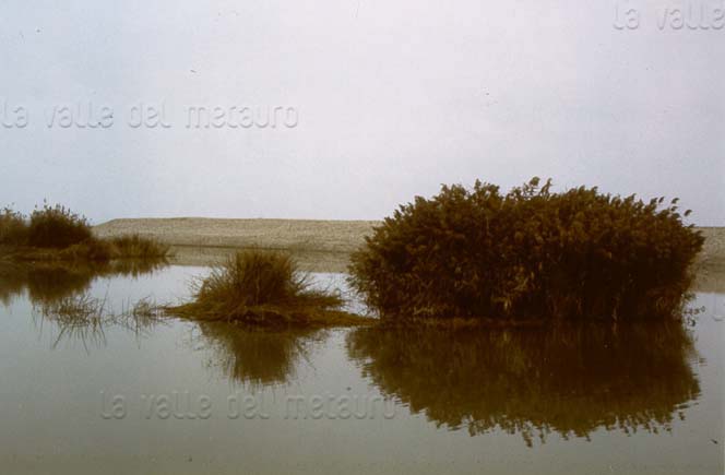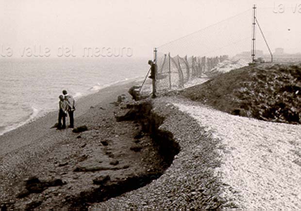Foce del Fiume Metauro, barra di foce, 1982. Sulla sinistra l'erosione ha messo allo scoperto una serie di pali, probabilmente le fondamenta di un antico molo