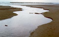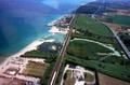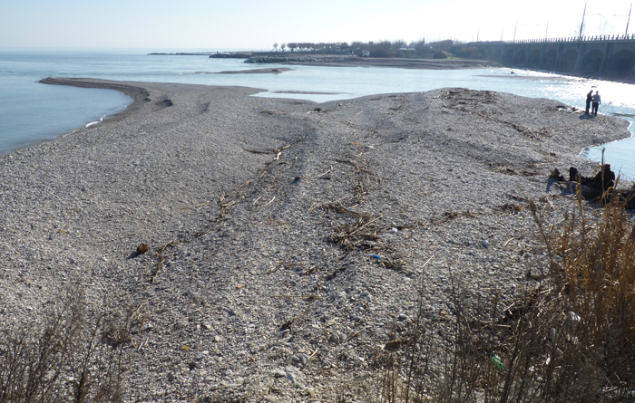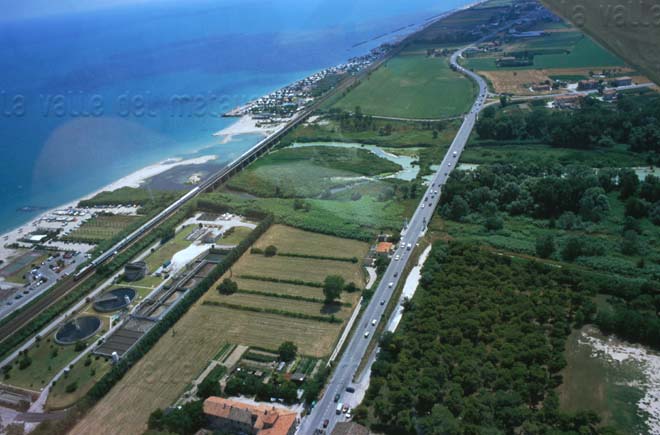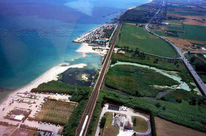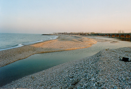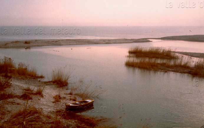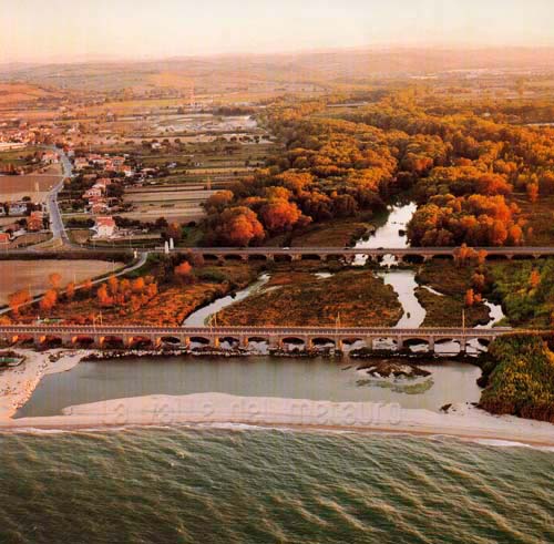 Foce del F. Metauro, 2001 (da calendario Marchigiana Mobili, 2002). Sono visibili il ponte ferroviario e quello della SS. Adriatica