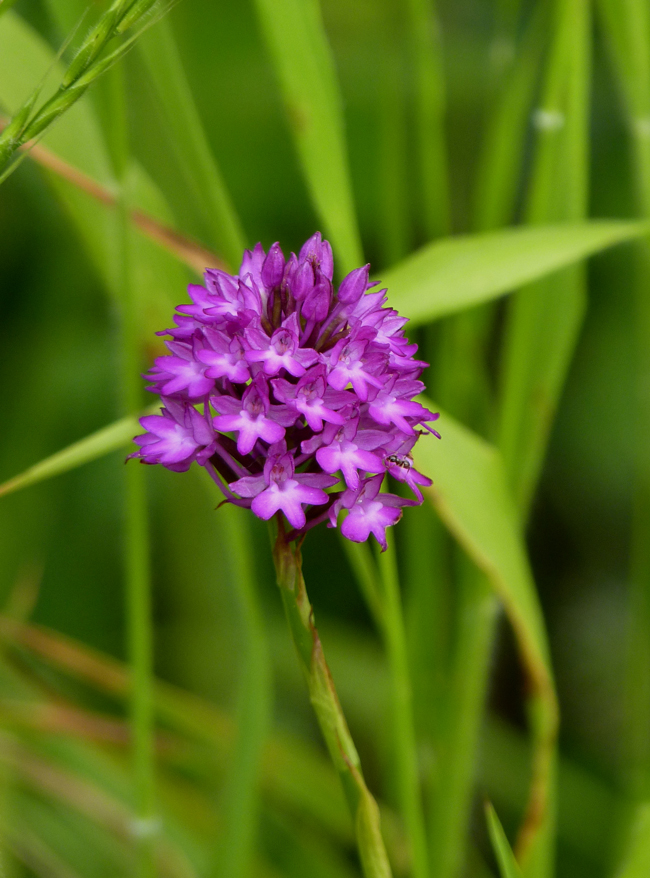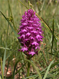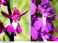 Anacamptis laxiflora rispetto ad A. palustris ha il lobo centrale del labello (indicato in blu) più corto dei laterali anziché uguale o più lungo; inoltre il labello è senza punti scuri e con parte centrale in genere bianchiccia e le brattee (qui non visibili) hanno lunghezza uguale o sono più corte dell’ovario, anziché più lunghe (foto 1 - J.M.I. Klaver, https://www.italiafelix.it; foto 2 - A. Berger, modif., https://floraionica.univie.ac.at, licenza CC BY-NC)