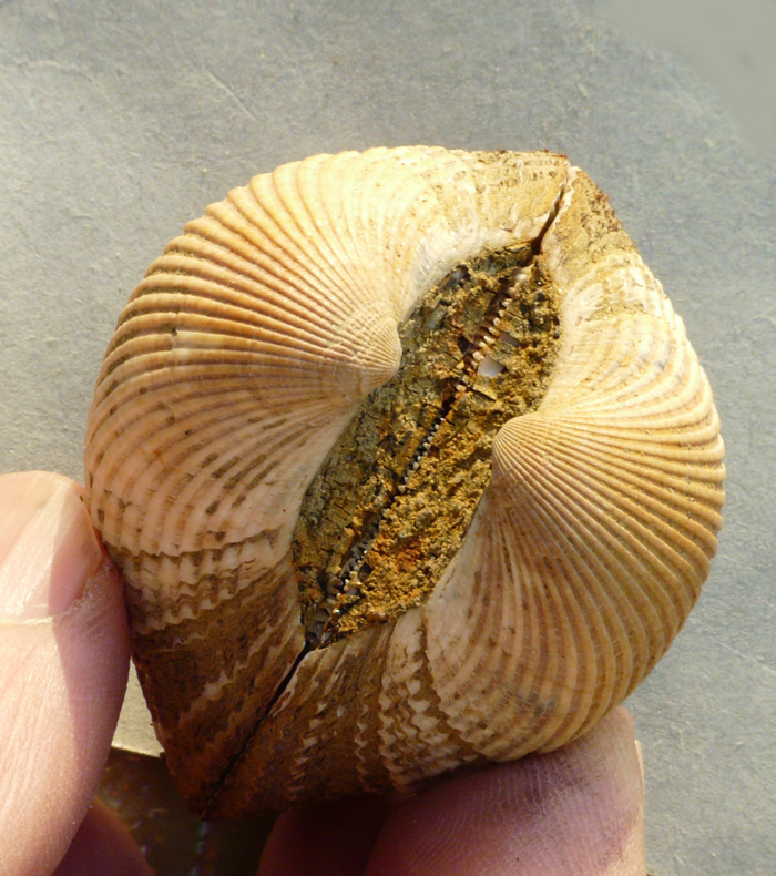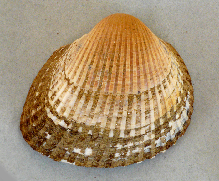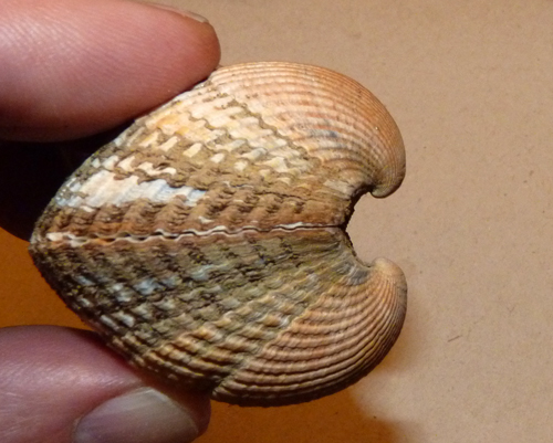 Anadara polii di 53 mm (umboni e zona posteriore), al largo di Pesaro a 60 m di profondità, giugno 1989