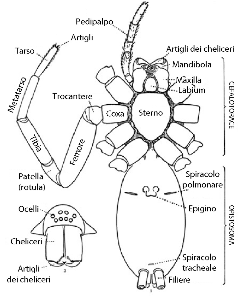 Anatomia di un ragno, lato ventrale (J.H. Emerton - Spider external anatomy, da: Wikimedia Commons, public domain)