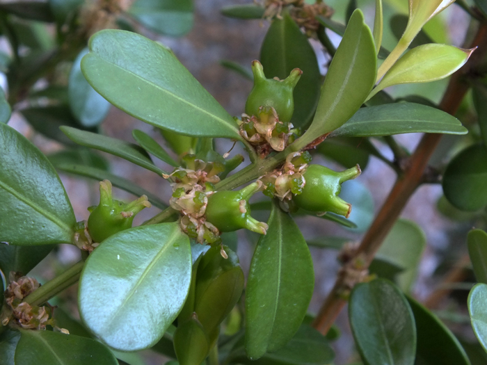 Frutti immaturi di Buxus sempervirens (esempl. coltivato), Fano, aprile 2013