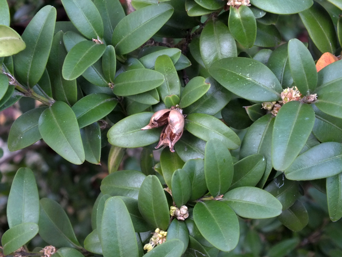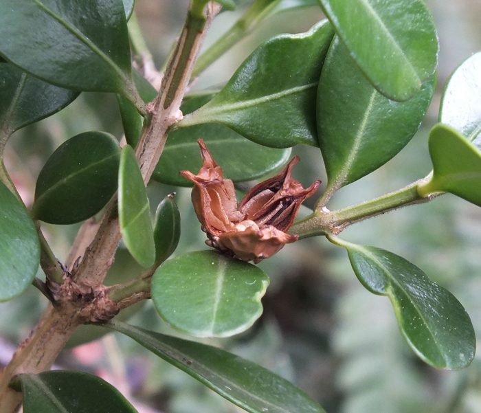 Frutto aperto di Buxus sempervirens (esempl. coltivato), Fano, ottobre 2013