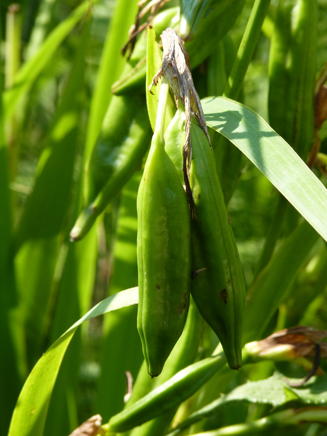 Frutti immaturi di Iris pseudacorus (proveniente da Punte Alberete, RA), Orto botanico di Casa Archilei a Fano, giugno 2011