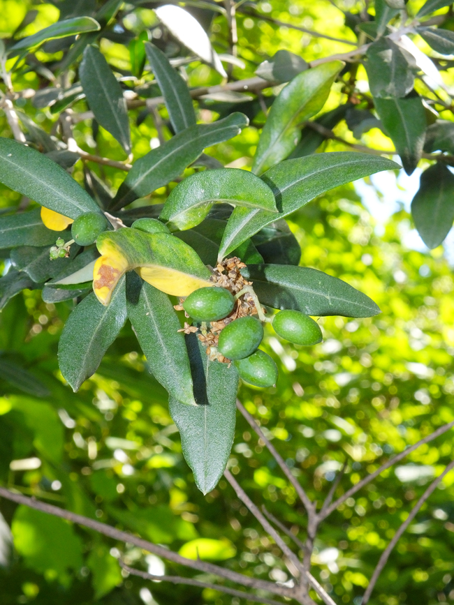 Frutti immaturi di Olea europaea nato da seme, periferia di Fano, luglio 2018