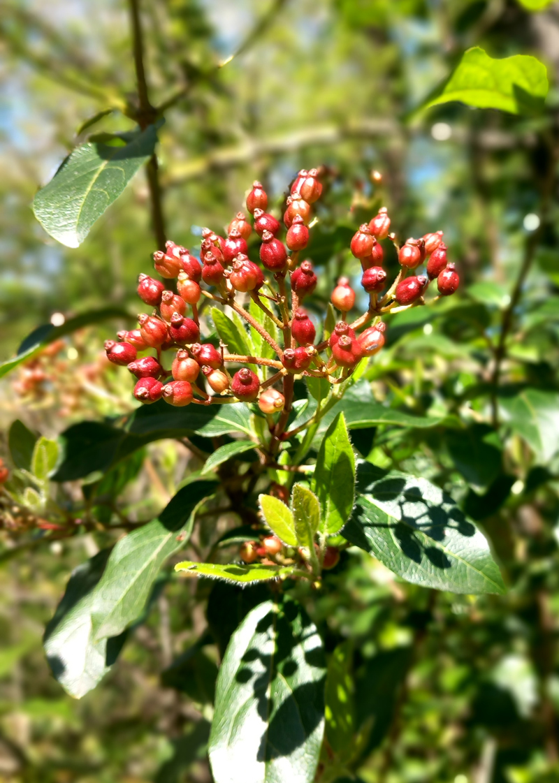 Frutti immaturi di Viburnum tinus, giardino botanico di Casa Archilei a Fano, fine marzo 2025